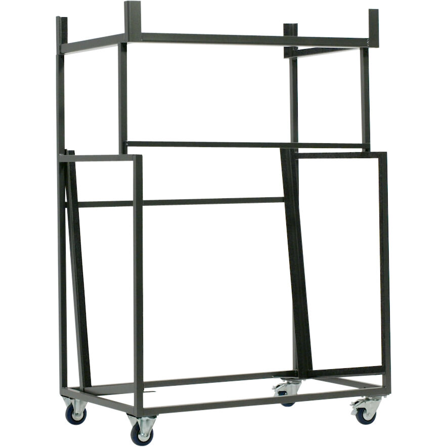 Châssis en acier Revêtement en poudre gris martelé Permet de stocker 20 tables/bancs Roues vulcanisées diam. 12,5 cm 2 roues pivotantes avec freins 2 roues fixes *Remarque : prix du chariot de transport monté, hors meubles